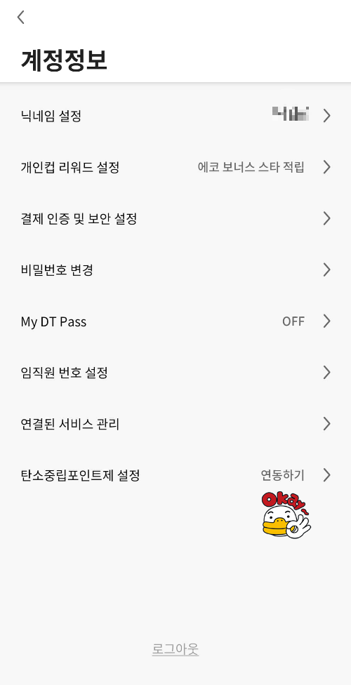 3. 중앙에 보이는 계정 정보를 눌러줍니다. 그리고 가장 아래에 ‘탄소중립포인트제 설정’을 눌러줍니다. 그리고 밑에 연동하기를 눌러줍니다.