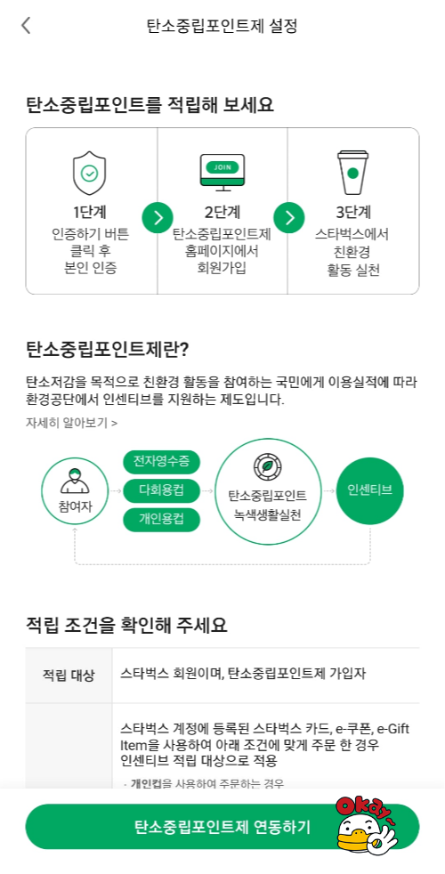 4. 가장 아래에 '탄소중립포인트제 연동하기'를 눌러주고 인증을 마칩니다. (탄소중립실천포인트 계정과 스타벅스 계정의 개인정보는 같아야 합니다.)